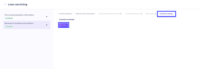 To declare an event, go to the relevant booking, then in the Loan lifecycle section, click on “Manage”. You will then have access to the Contract event(s) section.