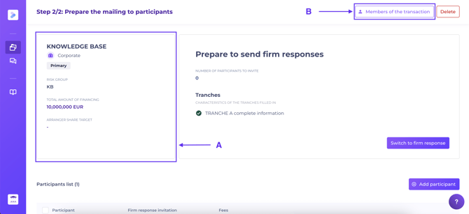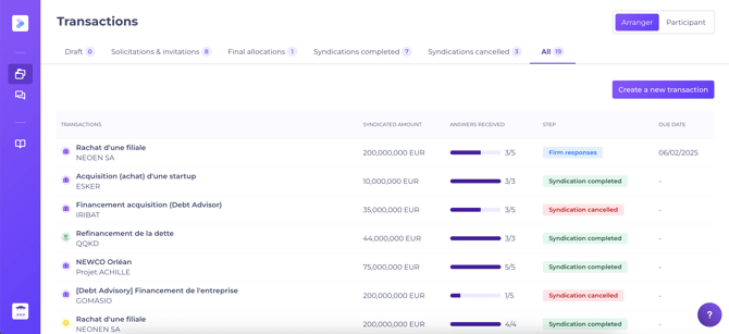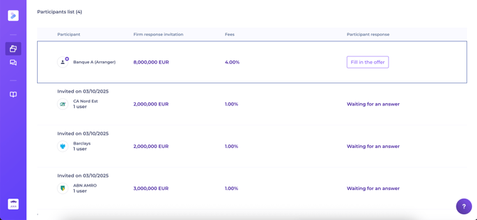 - Firm responses : your partners receive invitations to access the deal and submit their responses based on your offer. They review the information you provided and may indicate a committee approval or another decision. As Arranger, you can monitor all responses. Once a sufficient total value of offers is reached, proceed to final allocations.