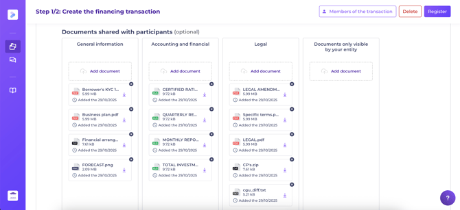 - Creating the financing deal : enter essential information such as transaction name, amount, upload documentation and the term sheet, etc.—to provide context for your stakeholders.