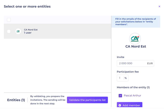 - Preparing to send invitations: choose which banks to invite and specify the amounts. Once selected, you can send invitations and proceed to the next stage.
