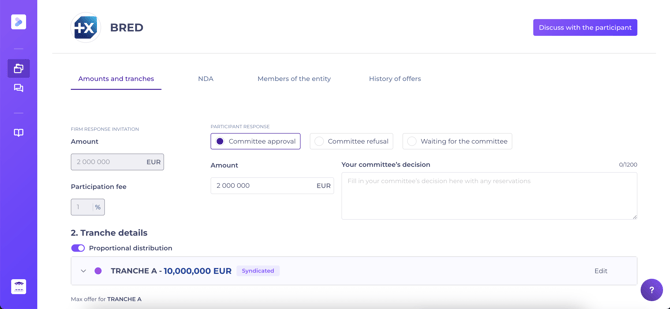 - Respond on their behalf: indicate committee approval/refusal, including participation amounts per tranche. The response will be labelled accordingly.