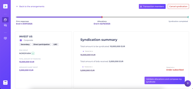 - Confirm by clicking “Validate allocations and compose my syndicate” to move to “Syndication completed”.