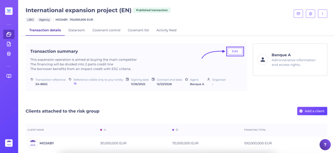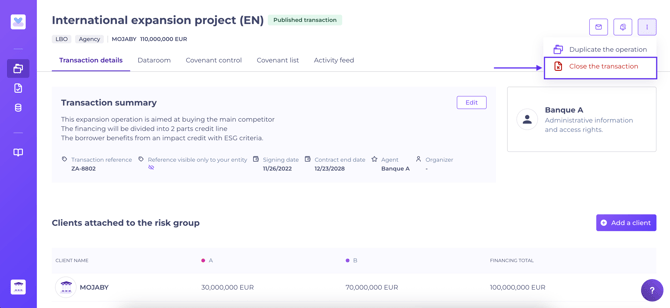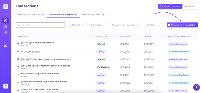 💡 For example, when undertaking a refinancing project or an amendment, creation is made easier. Close the historical version of the transaction before duplicating it to lock the information and ensure full traceability.