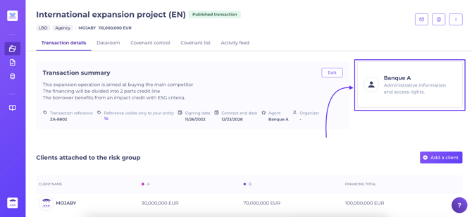 - Transaction Agent access management: add contacts within your entity who should help manage the deal. All gain the same access and can perform identical actions. You can :