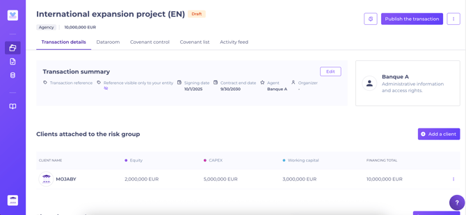 - “Transaction to prepare”: Unpublished transactions, visible only to the operation management team and your team manager. Until published, no lender or borrower has access. Key features (covenant control, monitoring, automatic notifications) activate only post-publication.