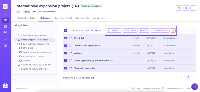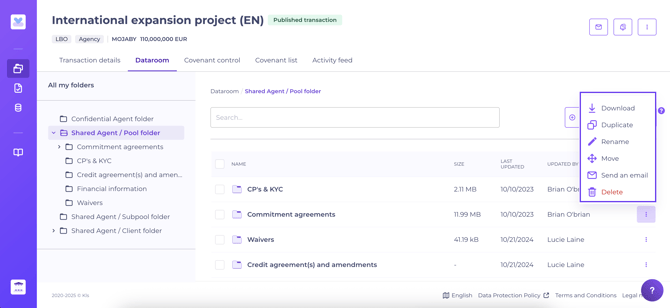 Each dataroom offers the following core functions: download, duplicate, move, delete and rename.