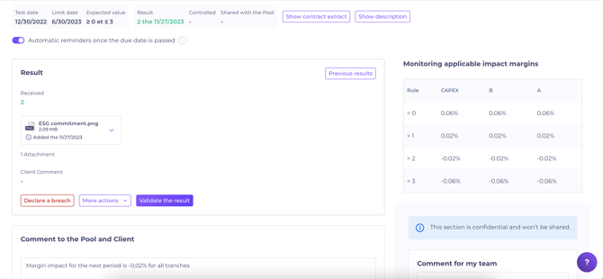 Once all KPIs results have been collected for the transaction, you can then complete this final covenant and apply the new, appropriate margin adjustment.