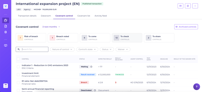 Once your transaction has been created in Kls, navigate to the “Covenant list” tab to set the relevant control indicators.