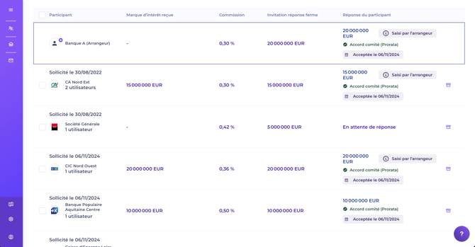 - Réponse ferme : À cette étape, vos partenaires ont reçu votre invitation à accéder au dossier et à renseigner leur réponse en fonction de l'offre reçue. Ils vont prendre connaissance de tous les éléments renseignés à l'étape d'avant et peuvent indiquer un accord comité ou toute autre décision. En tant qu'Arrangeur, vous aurez vu sur la saisie de vos partenaires. Une fois que le montant des offres reçues est suffisant, vous pouvez passer à l'étape suivante : les allocations finales.