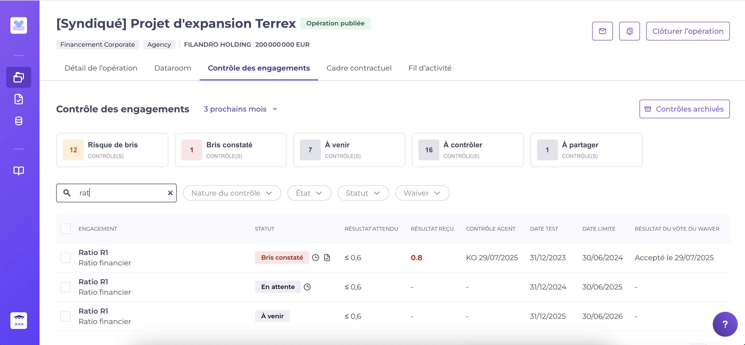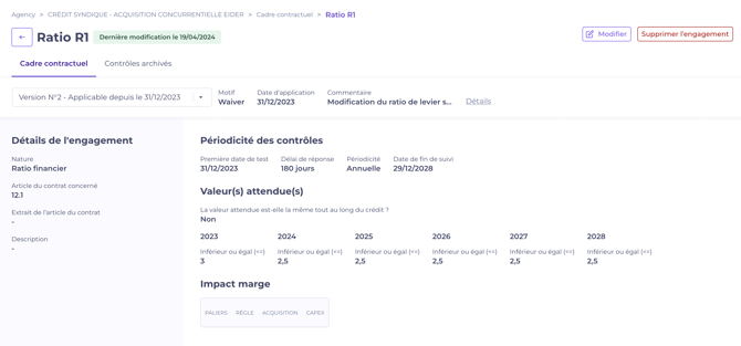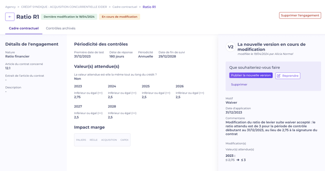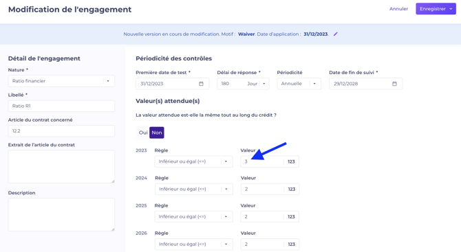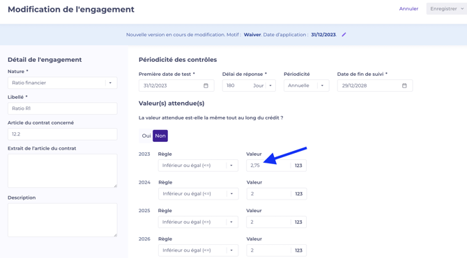 Cas exemple : je souhaite modifier la valeur attendue du ratio de levier de 2023 suite à la validation d'un waiver. La valeur attendue est de 3 au lieu des 2,75 initialement prévus à la signature du contrat.