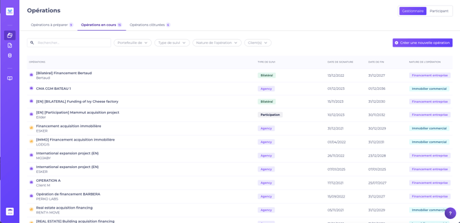 Chaque opération créée correspond à un dossier distinct dans Debt Tracking. Il est possible de gérer une multitude d'opérations en simultané et de pouvoir filtrer les différentes vues par portefeuille ou par statut d'opération (à préparer, en cours, clôturé).