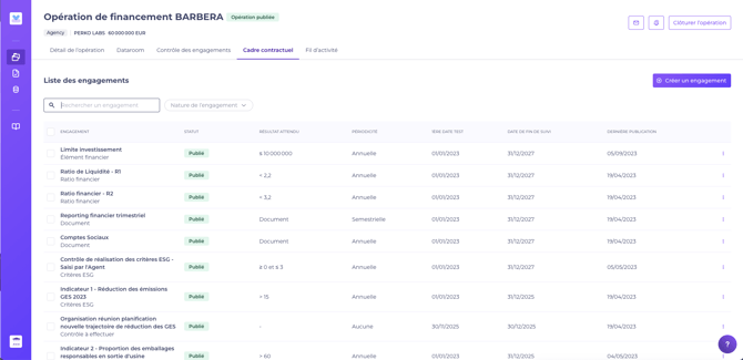 - Centraliser les éléments de contrôle du contrat, comme les covenants, les critères ESG, les engagements de ne pas faire...