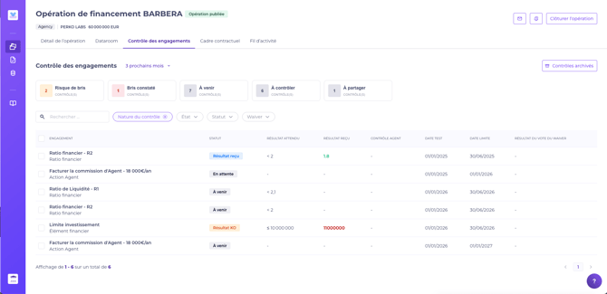 Le gestionnaire digitalise ces éléments en créant un cadre contractuel pour chaque élément à contrôler. De cette manière, il facilite la lecture et la traçabilité pour tous, car chaque partie pourra alors retrouver la liste des engagements dus par le client sur son espace Debt Tracking. - Automatiser les relances auprès du client en paramétrant à l'avance les périodes de contrôles.