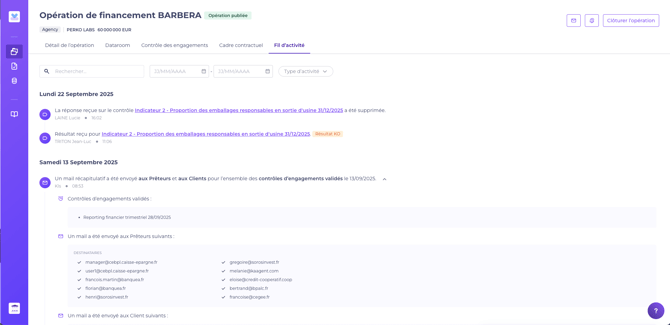 Ce dernier onglet a un objectif de suivi des actions dans un contexte de traçabilité. Il est uniquement visible par l'équipe gestionnaire et permet de consigner automatiquement tous les événements notables qui se sont produits sur l'opération, en plus d'avoir une visibilité sur les notifications envoyées (et leurs destinataires).