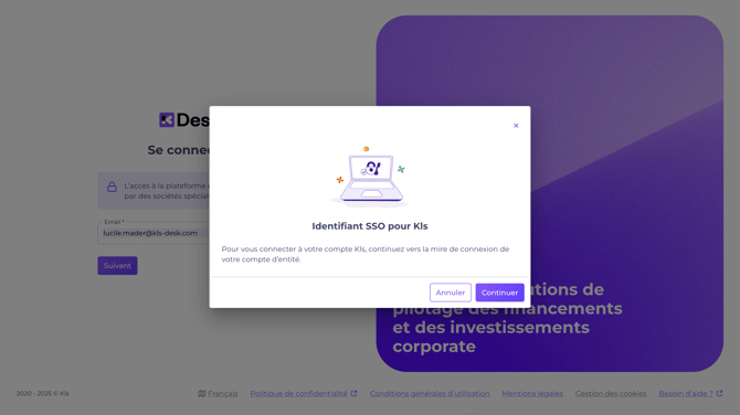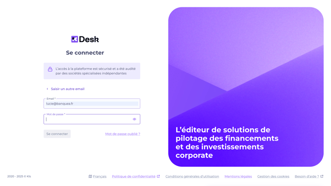 Saisissez votre adresse e-mail sur la page de connexion du Desk : https://app.kls-platform.com/